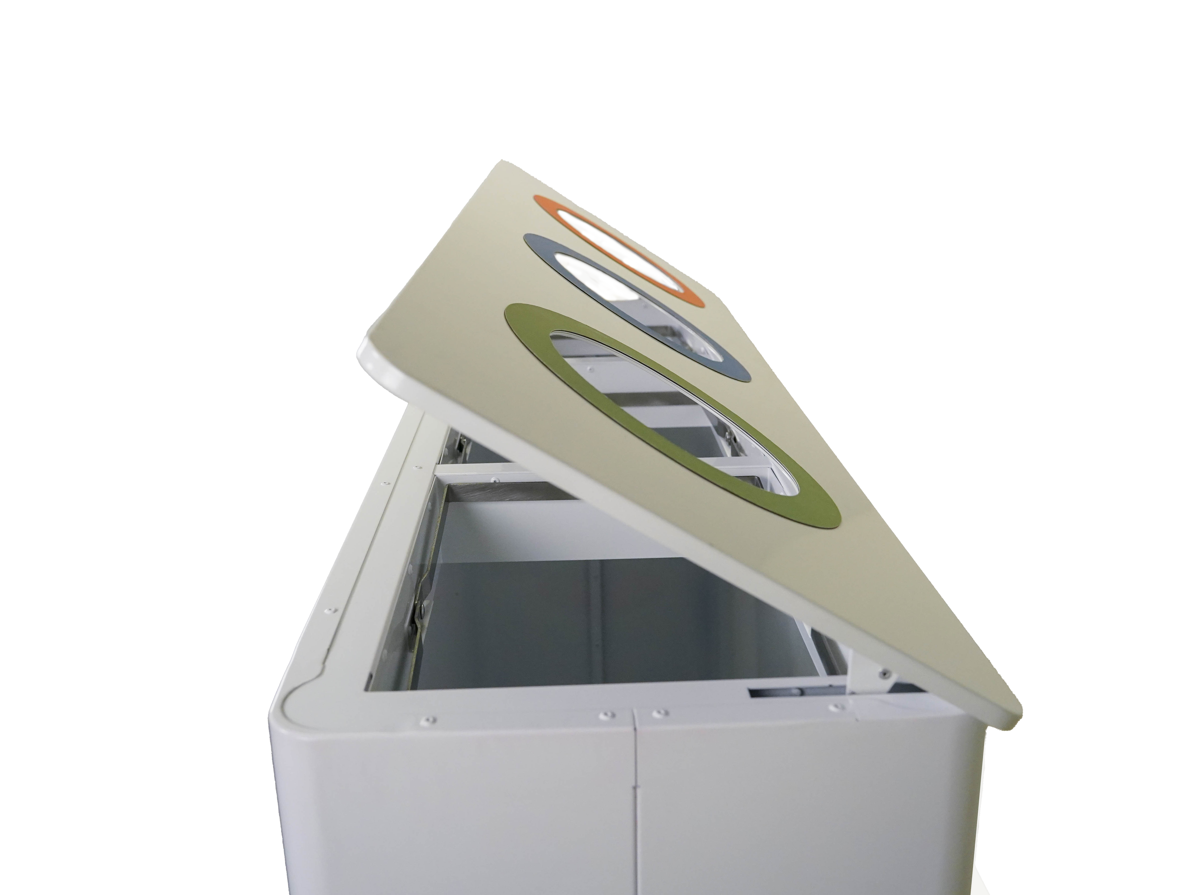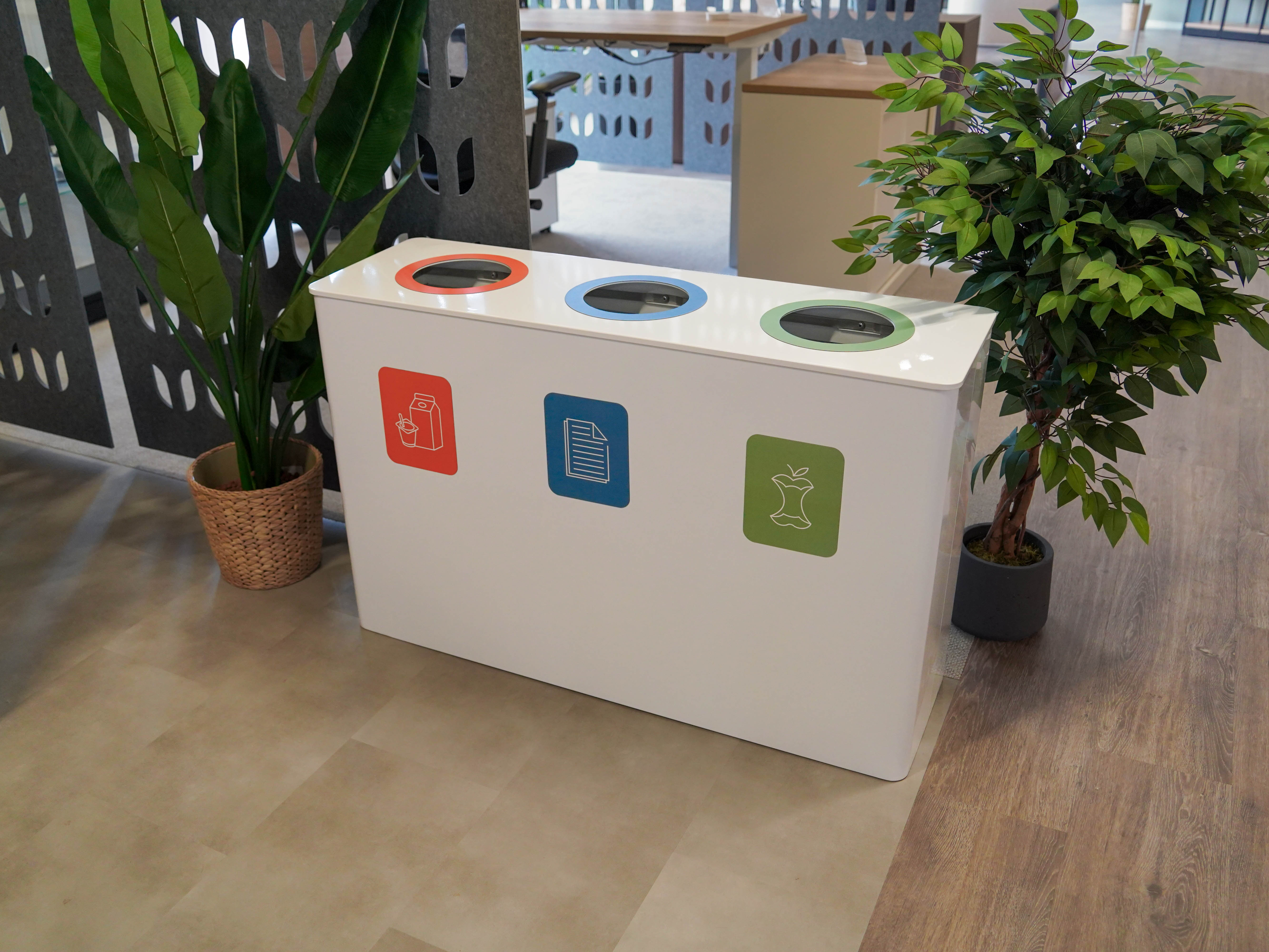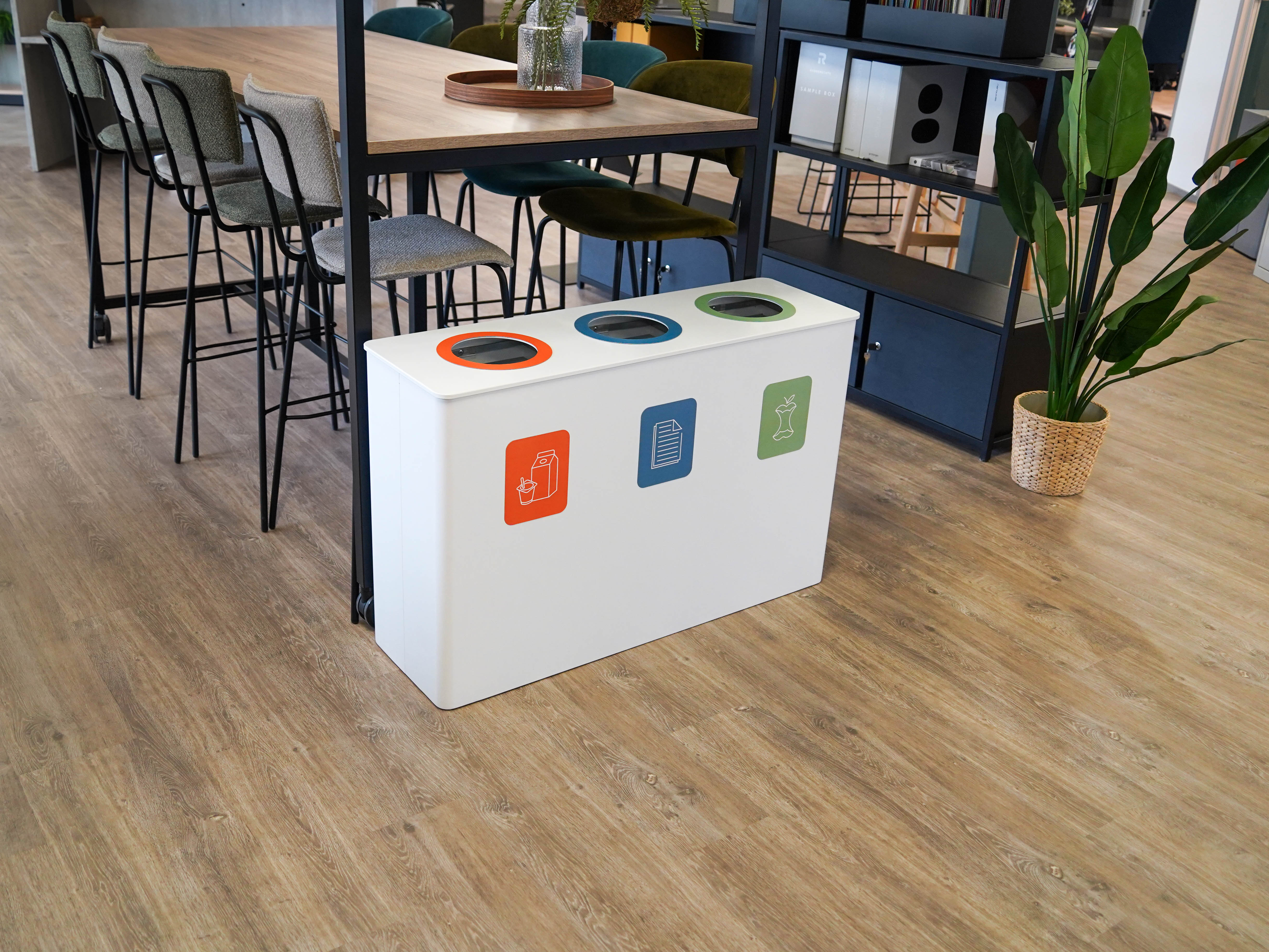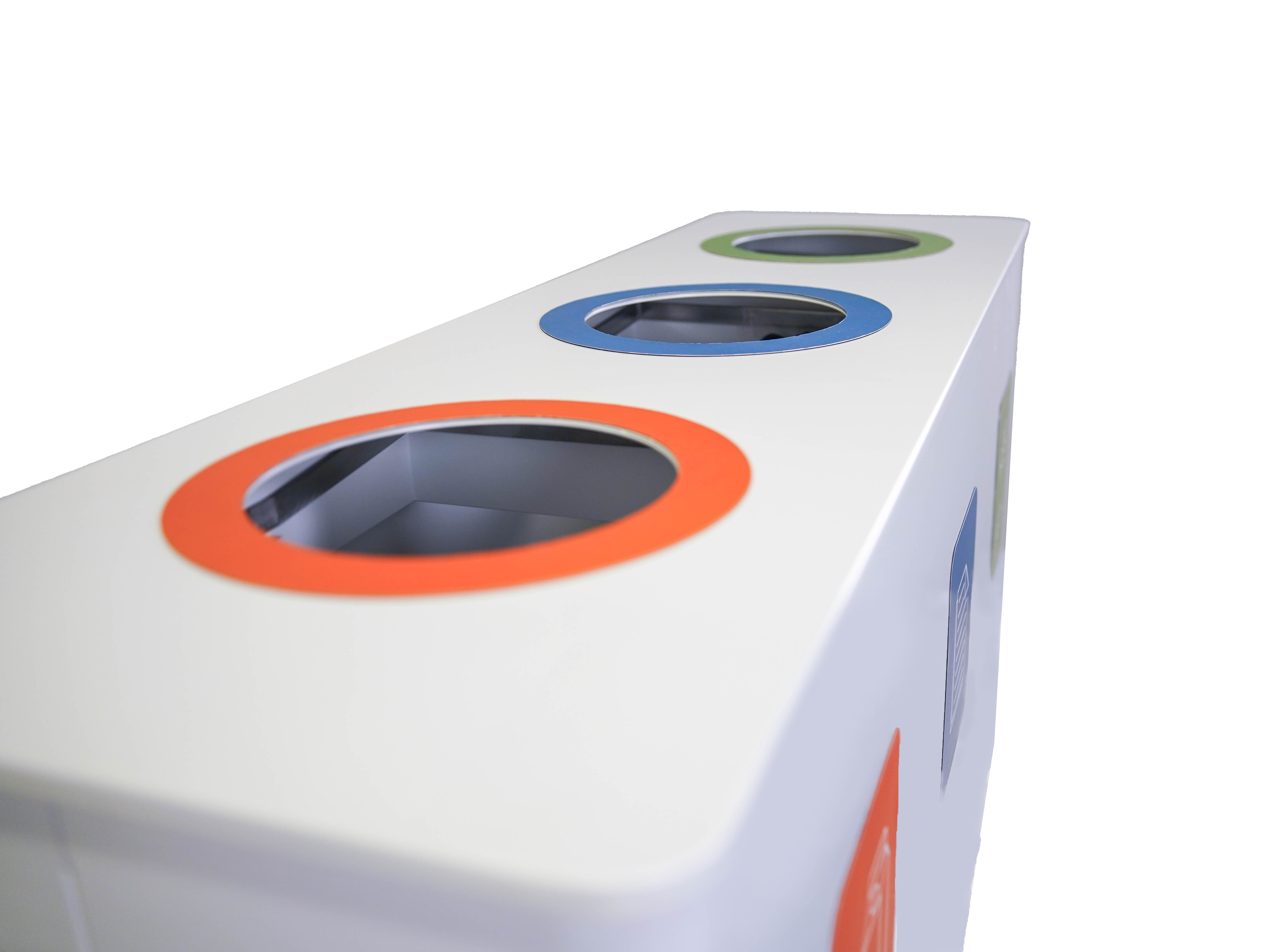 Modern 3-compartment waste separation bin makes waste sorting easy and organized. Its sleek design makes it a stylish addition to any office space, pantry or canteen.